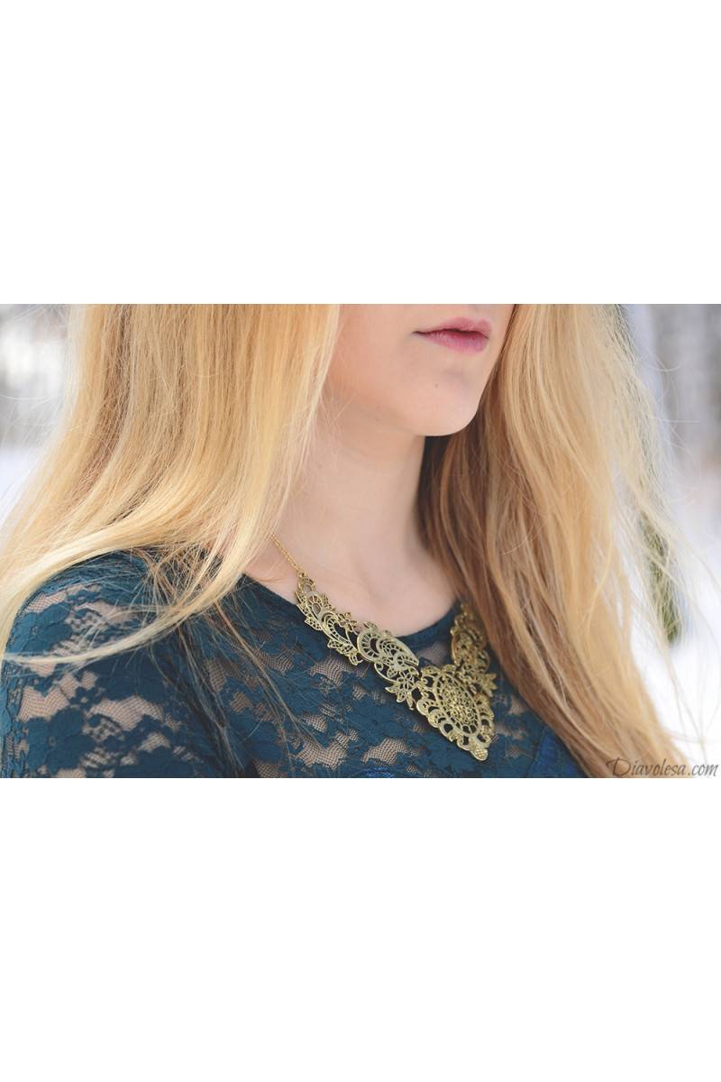 Išskirtinio dizaino kaklo papuošalas "Royal Games". Jis yra aukso spalvos ir pagamintas iš metalo - aliuminio. Papuošalą siūlome derinti su megztukais, marškiniais ar palaidinėmis aukšta apykakle.