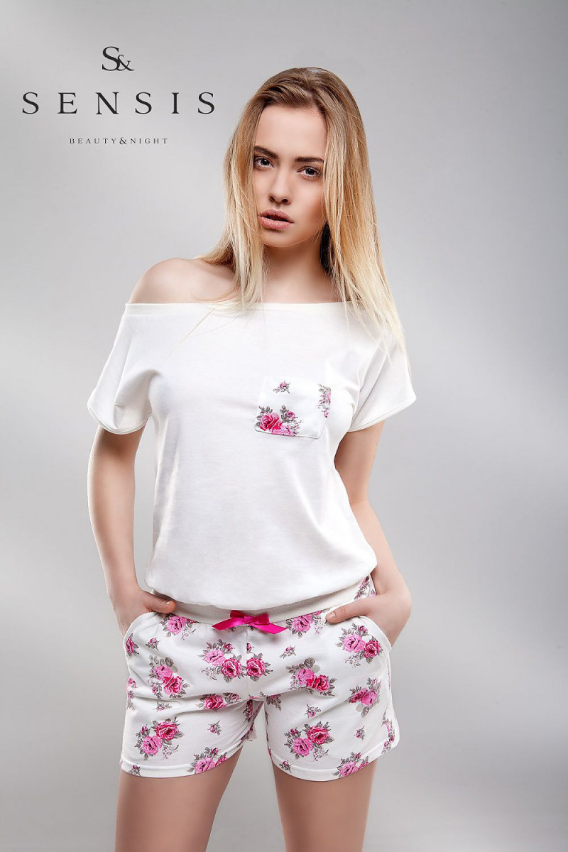 Comfortable women's pyjamas decorated with a charming Christmas motif. Made of pleasant-to-touch cotton. The cut looks nice on the silhouette. Black palaidinė in the form of a t-shirt with a beautiful almond neckline and a print in the middle. Short pants, light, in cookies, with a beige bow at the waist.