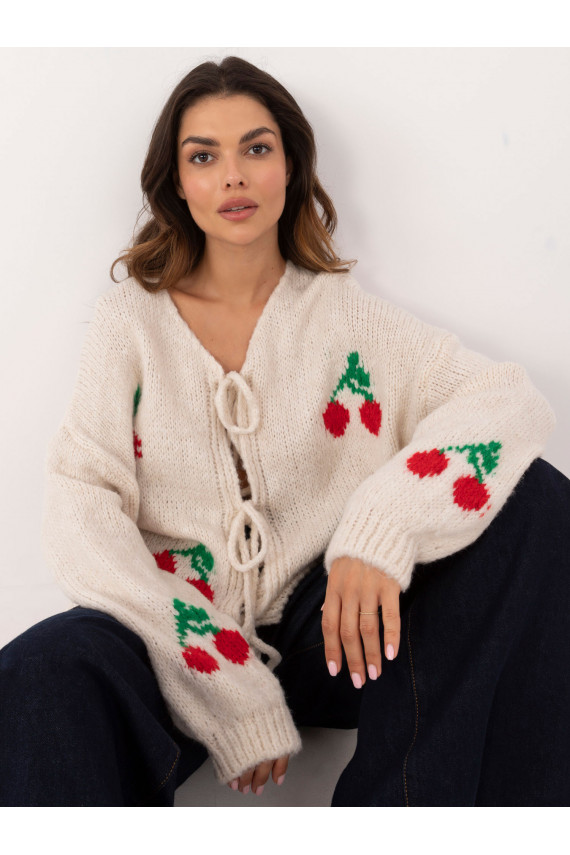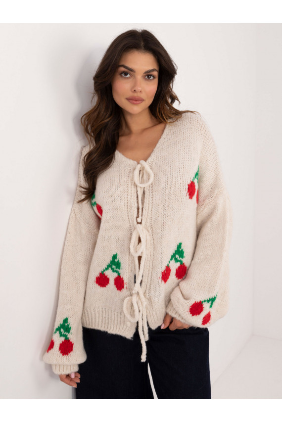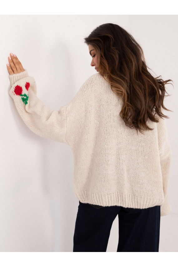 Vieno dydžio megztinio matmenys matuojami plokščiai: pažasties plotis - 69 cm, rankovių ilgis - 67 cm, bendras ilgis - 63 cm.