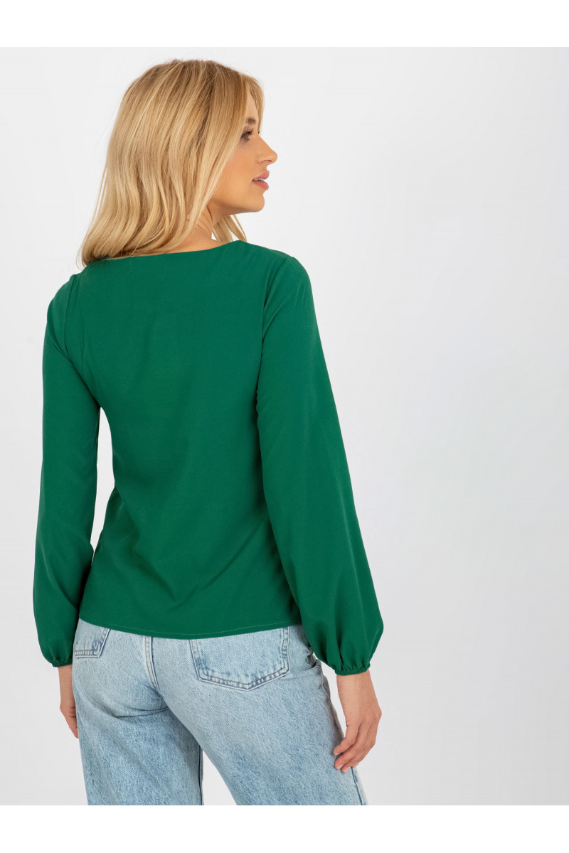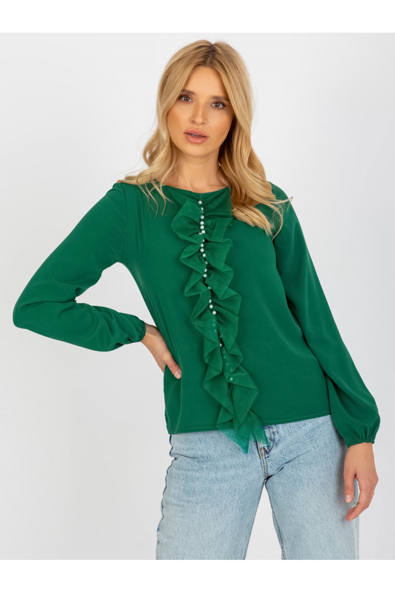 Tamsiai žalia iškilminga palaidinė su aplikacijomis ir tinkleliu.