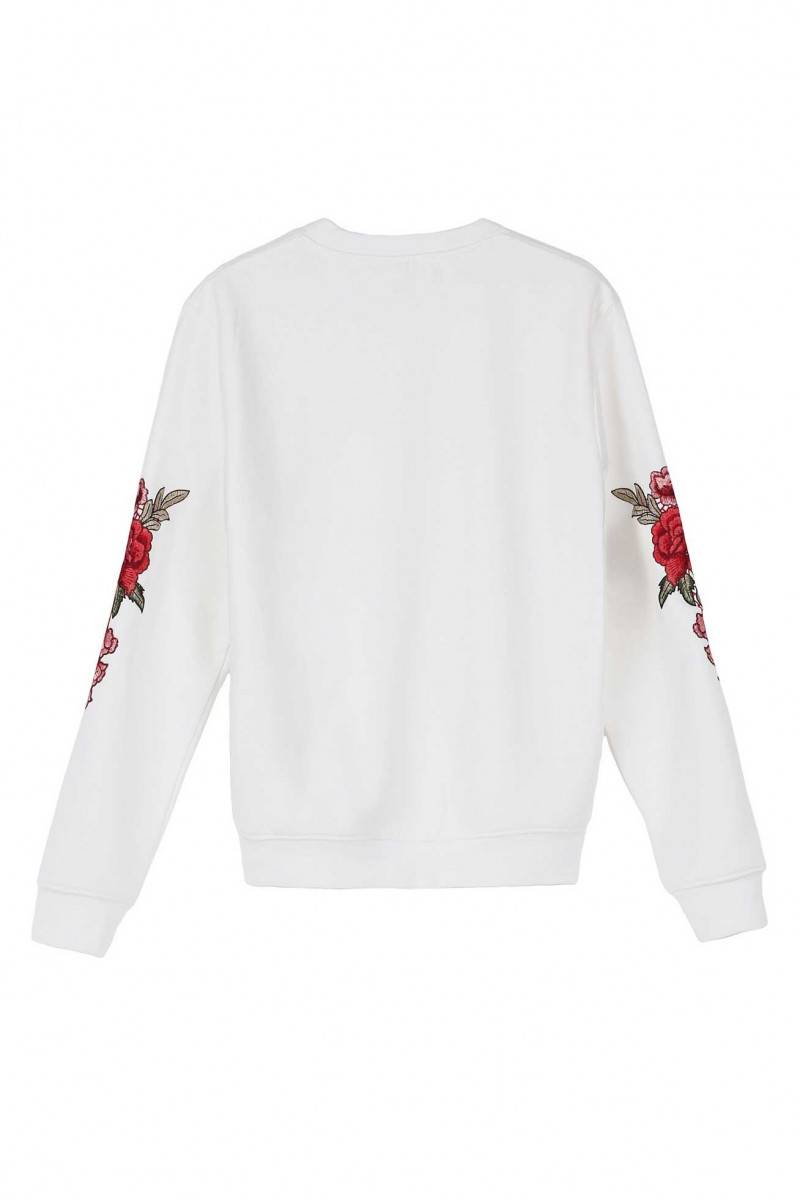 Madingas baltos spalvos džemperis ilgomis rankovėmis. Ant džemperio rankovių yra tarsi siuvinėtos gėlės. Džemperio kaklo iškiprtė yra ovalo formos. Medžiaga: 35% medvilnė, 65% poliesteris. Gėlių motyvų dydis 14x30 cm.
