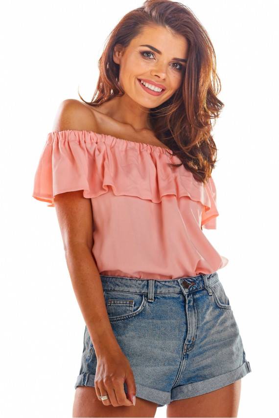 Palaidinė with open shoulders in trapeze cut in juicy summer colors. The neckline on an elastic band beautifully exposes the shoulders. A frill adds lightness. Made of airy and breathable natural viscose. Palaidinė ideal for summer. The product was manufactured in Poland.