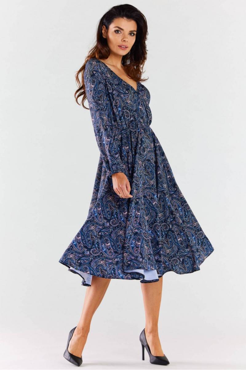 Midi suknelė with envelope neckline. Long sleeves and a flared hem. Elastic waistband provides a perfect fit to the body. Product made in Poland.