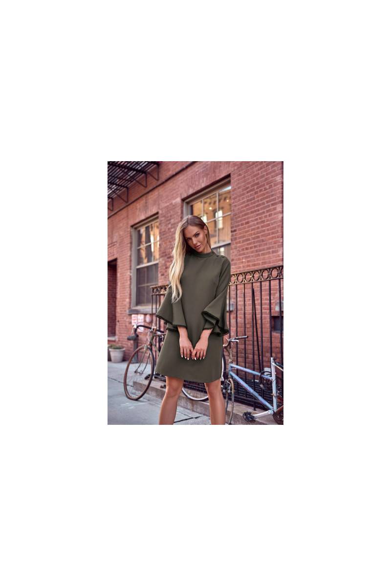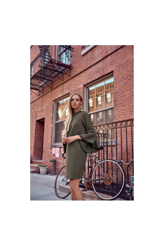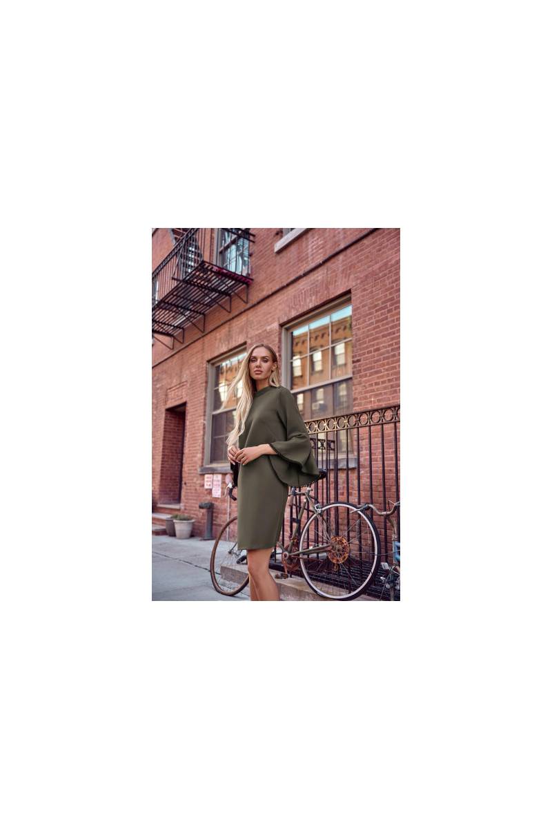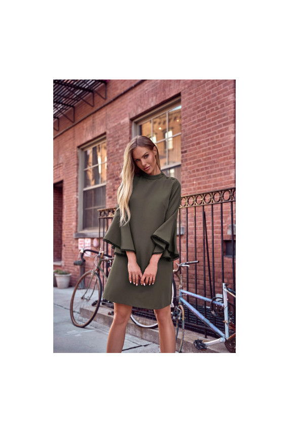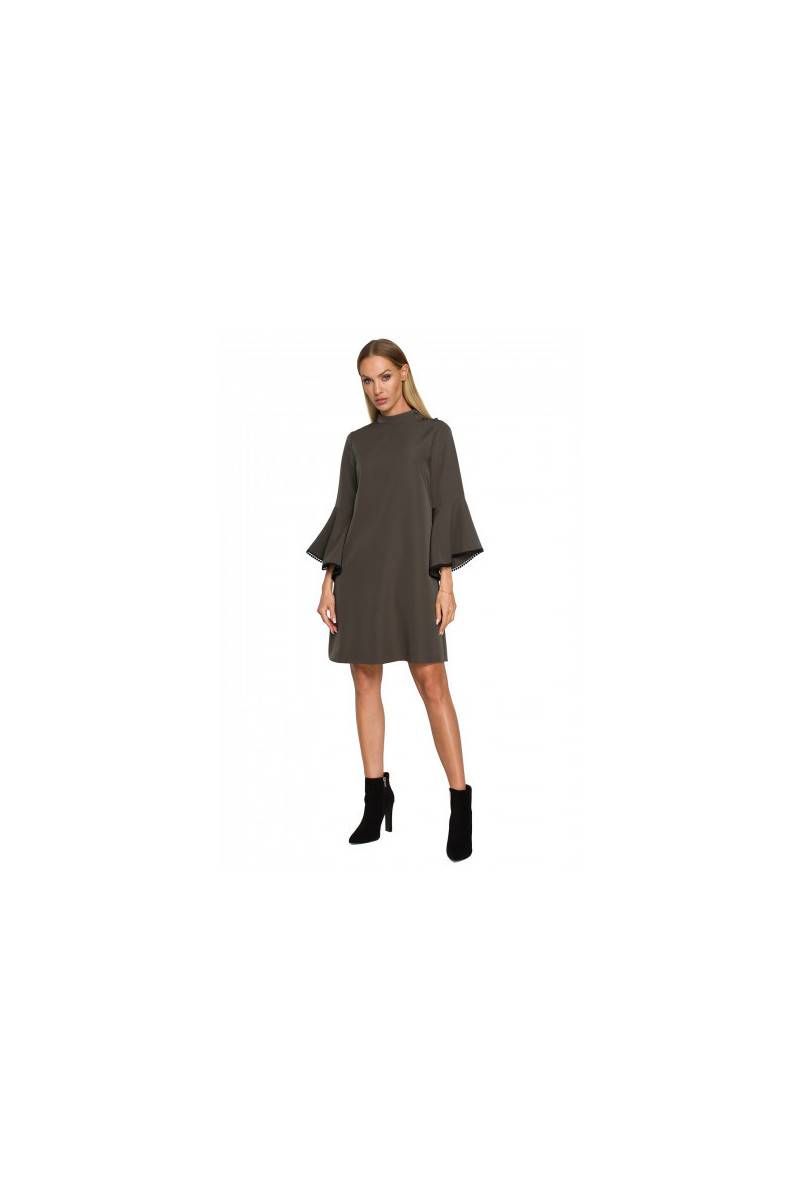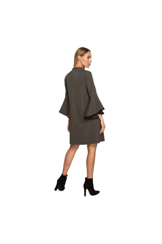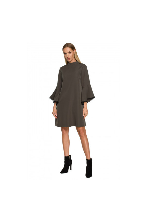 A suknelė with a trapezoidal or otherwise A-line cut not only adds girlish charm, but also helps to cover up the shortcomings of the figure. We still took care of the details that make it unique, the wide, ruffled sleeves were decorated with a delicate ribbon with spherical piping. The suknelė is unlined.