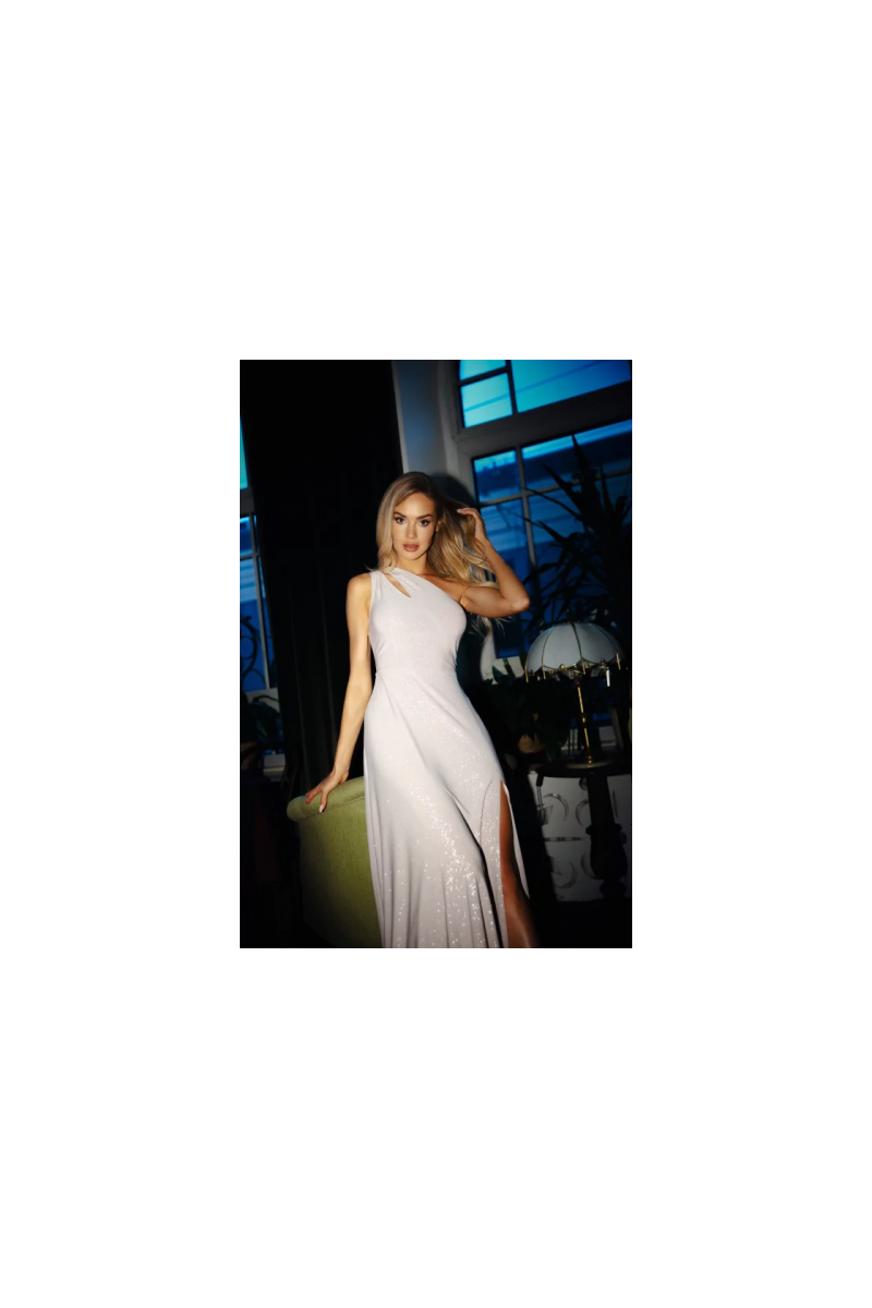 Dignified and elegant, a suknelė for special occasions. Long, flared with a high leg slit and a fitted top. One-shoulder cut with a sexy cutout catches the eye and emphasizes the neckline. The suknelė is made of brocade Medžiaga:, unlined and fastened with a covered zipper.