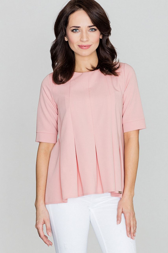 Slightly oversize form allows to cover up body imperfections. A line with a slightly longer back, short sleeves finished with a cuff. Round neckline, close to the neck, fastened at the back with a covered zipper. Convertible pleats at the front.