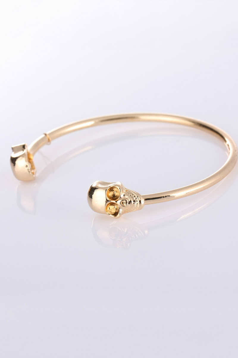 Aukso spalvos apyrankė "Skulls", vaizduojanti dvi kaukoles. Pagaminta iš bižuterinio metalo, kokybiška. Metalas lankstus, galima palenkti, jei reikia, taikant prie riešo dydžio. Pirkėjui atsiunčiama dailiai supakuota dėžutėje, su etiketėmis. Pakuotė tinkama dovanoti.
