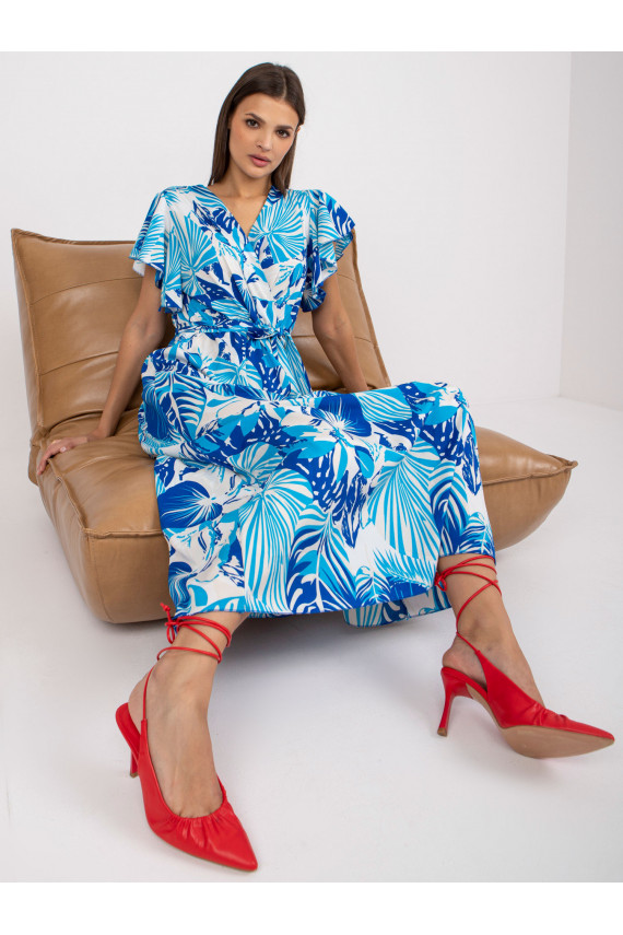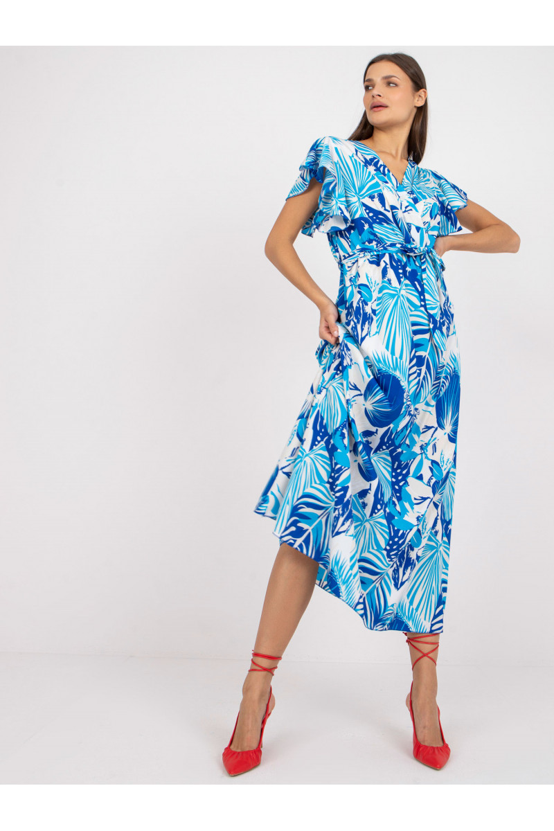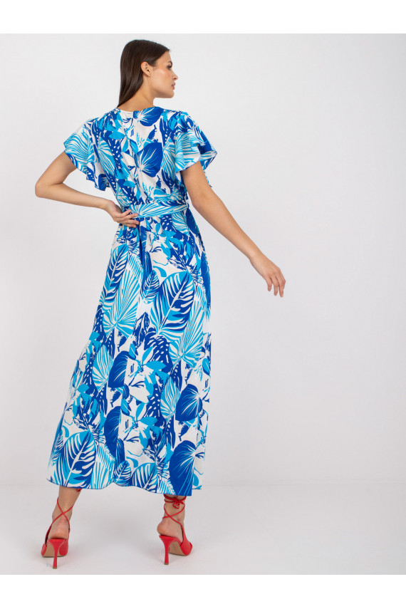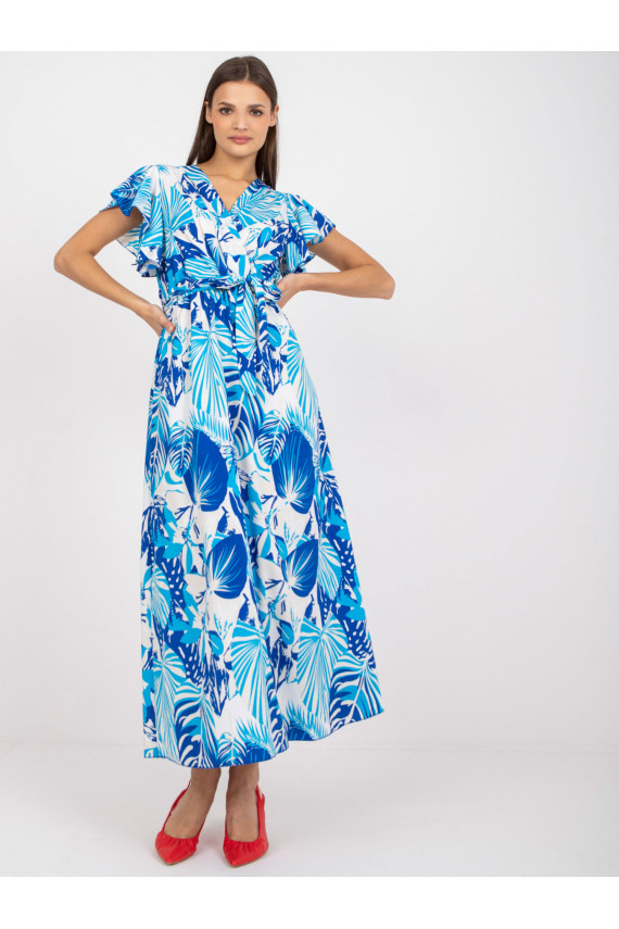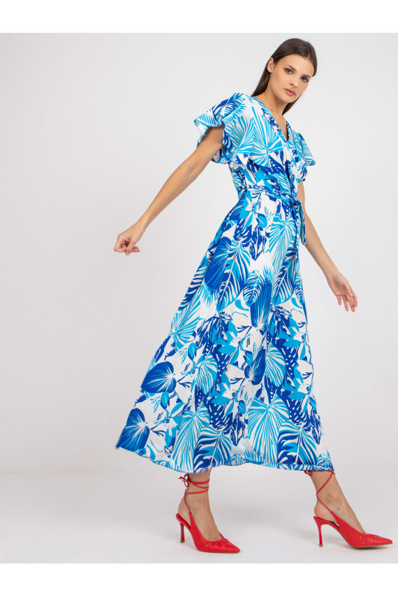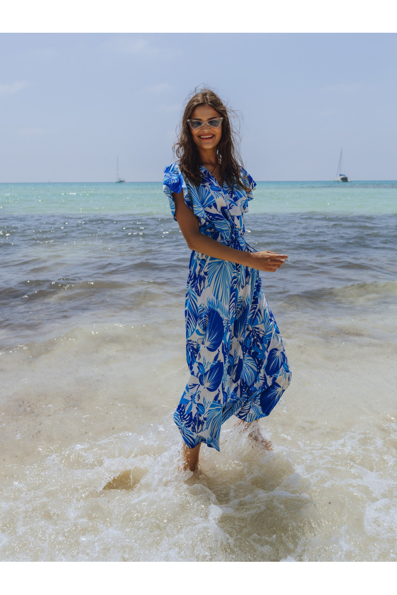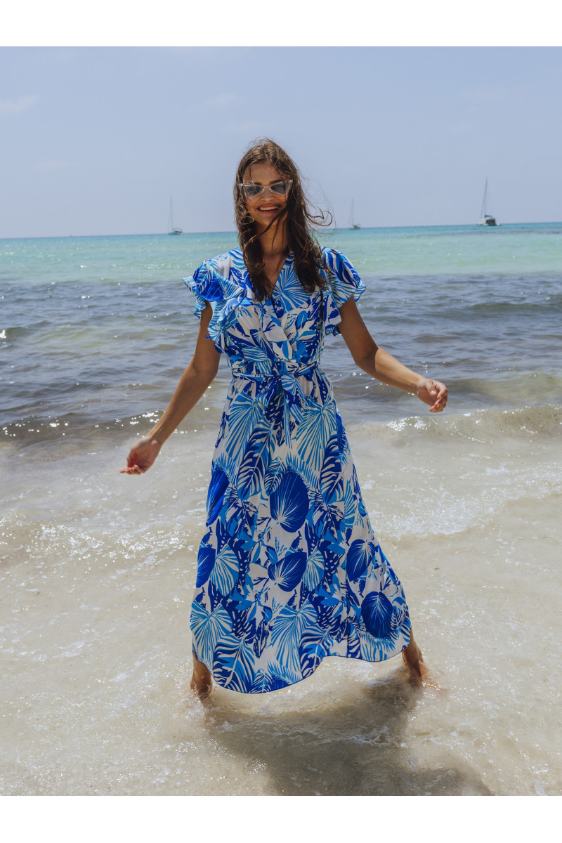 Balta ir dangiška maksi suknelė su raštais ir įvyniojama iškirpte.