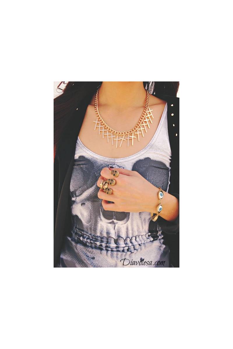 Prabangus kaklo papuošalas, sudarytas iš grandinėlės ir daugelio nedidelių kryželių. Kaklo papuošalas yra iš metalo - aliuminio (grandinėlė) ir plastiko (kryželiai). Papuošalas gali būti užsegamas pagal individualų poreikį - arčiau arba toliau nuo kaklo (žr. išmatavimus).