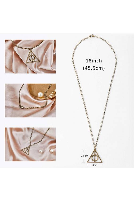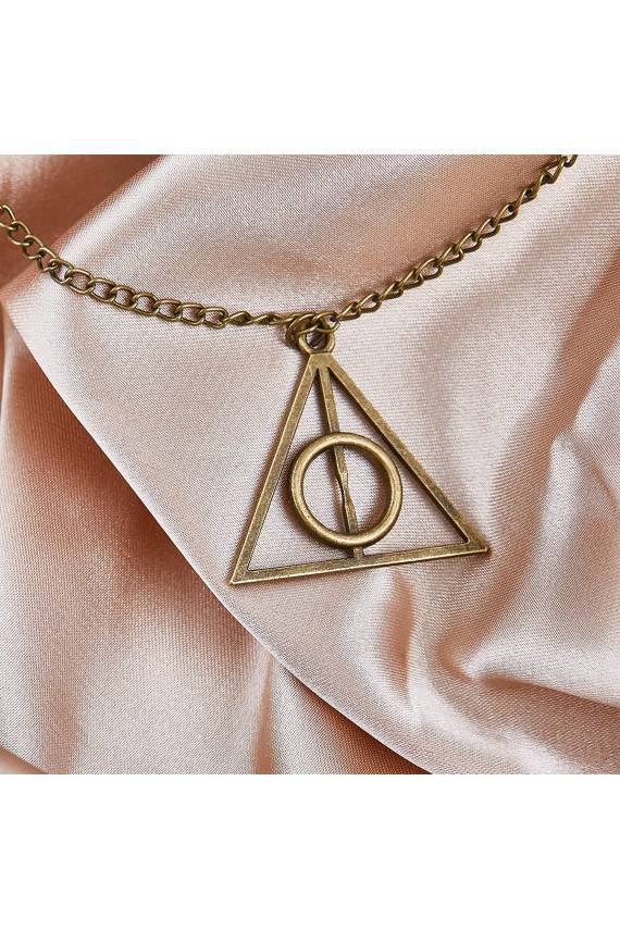 Ilgas kaklo papuošalas, vaizduojantis garsaus rašytojos J.K. Rowling romano "Mirties relikvijų" simbolį.