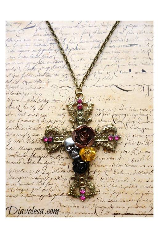Kryžius yra bronzos spalvos, dekoruotas rožinėmis akutėmis,