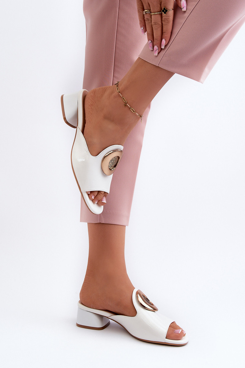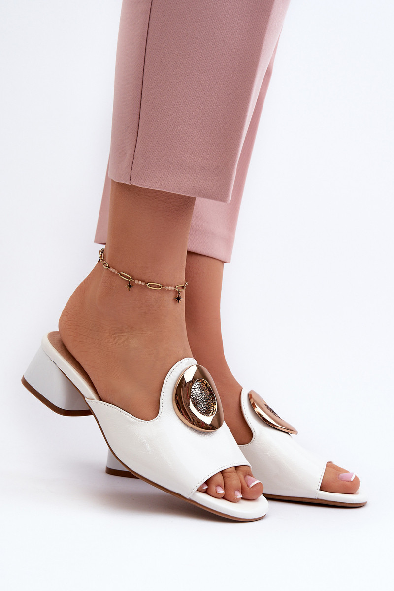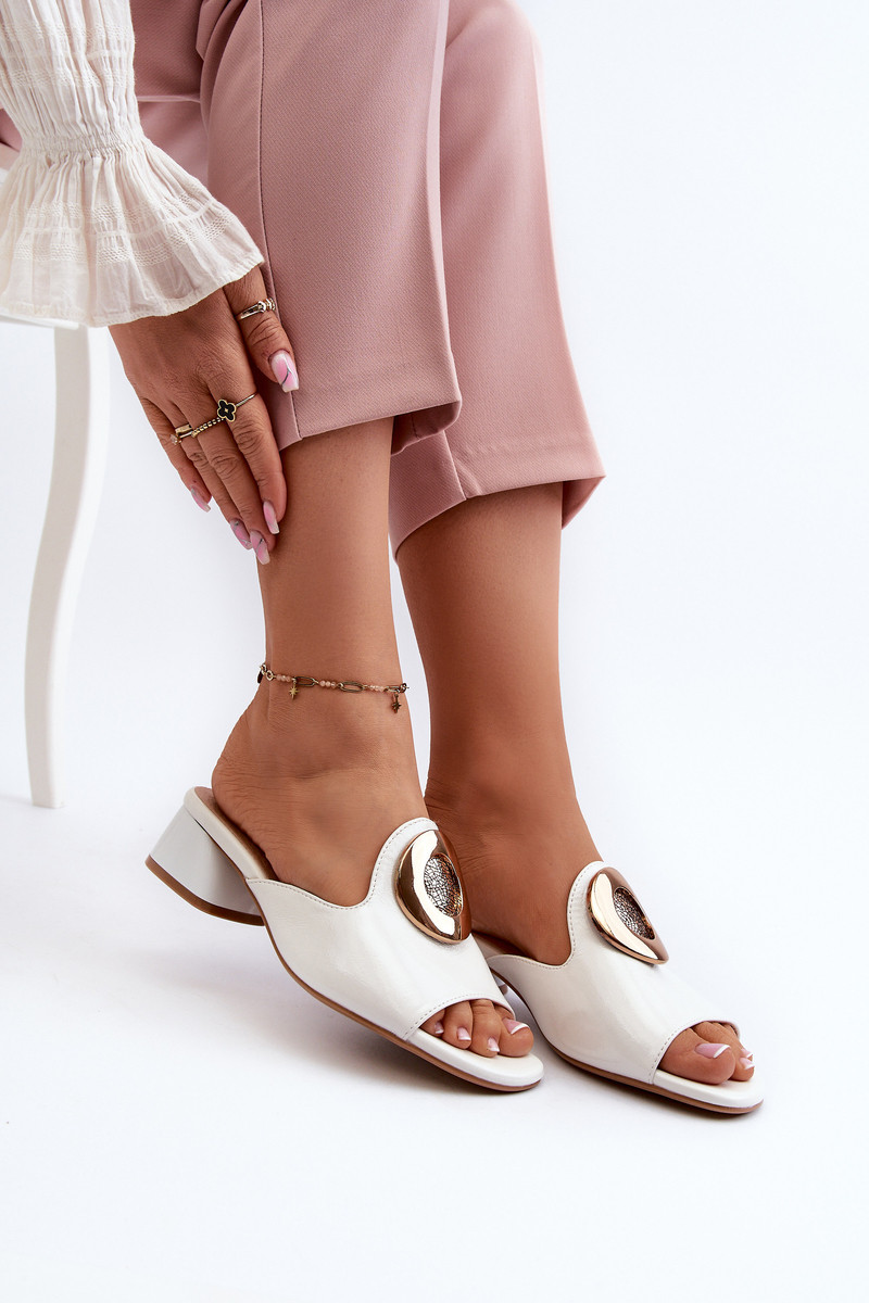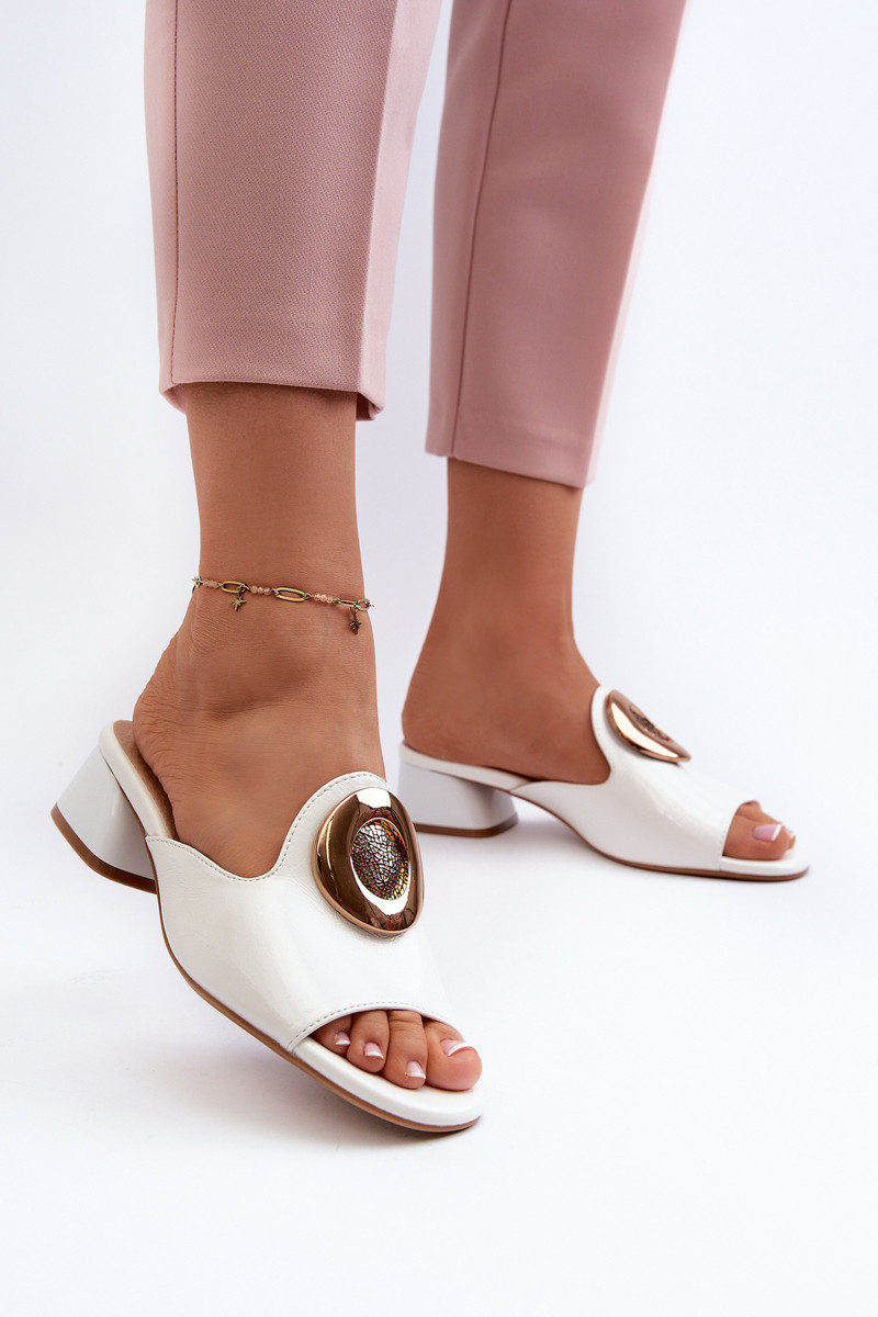 Elegantiško stiliaus moteriškos šlepetės žemu kulniuku su aukso spalvos detalėmis baltos spalvos Uzimila