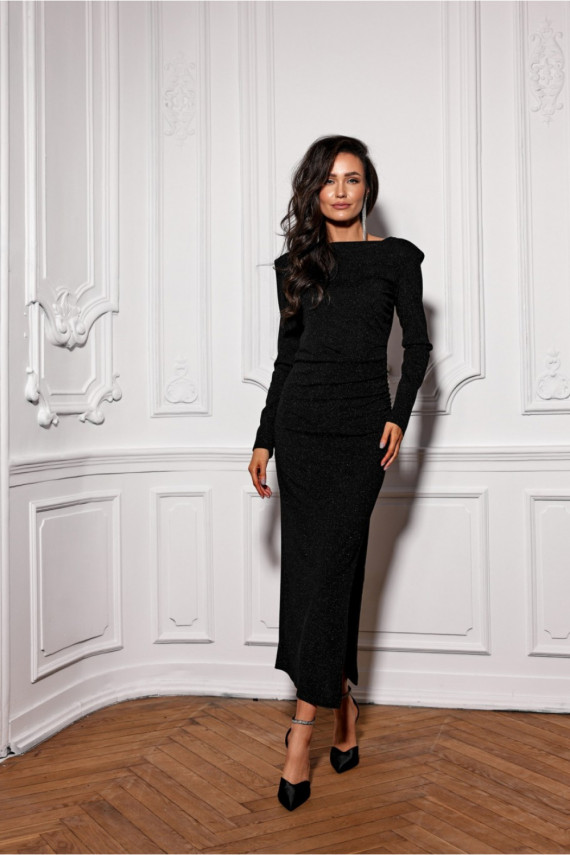 Suknelė pasiūta iš medžiagos su blizgiais akcentais, kurie gražiai mirga šviesoje. Elegantiška laivelio iškirptė subtiliai pabrėžia pečių liniją, suteikdama visumai jausmingą charakterį. V formos iškirptė suknelės gale suteikia jai ypatingo žavesio ir moteriškumo. Įspūdingas kojos plyšys yra pagrindinis elementas, kuris ne tik plonina siluetą, bet ir užtikrina patogumą dėvint. Šoninis raukšlėjimas subtiliai paryškina klubų formą. Pečių pagalvėlės suteikia suknelei modernumo ir struktūros, puikiai dera su mados tendencijomis ir išryškina pečius. Suknelė elastinga ir puikiai priglunda prie silueto, priglunda prie moteriškų linkių. Nesvarbu, ar planuojate nakvynę mieste, ar elegantišką vakarėlį, ši suknelė taps jūsų mėgstamiausia garderobo dalimi. Lengva formuoti stilių, priderinti prie elegantiškų kulnų ir papuošalų arba atrodyti laisvalaikiu su auliniais batais ir nedideliu grandininiu krepšiu, kad sulaužytumėte stilių. Gaminys pagamintas ir pasiūtas Lenkijoje.
